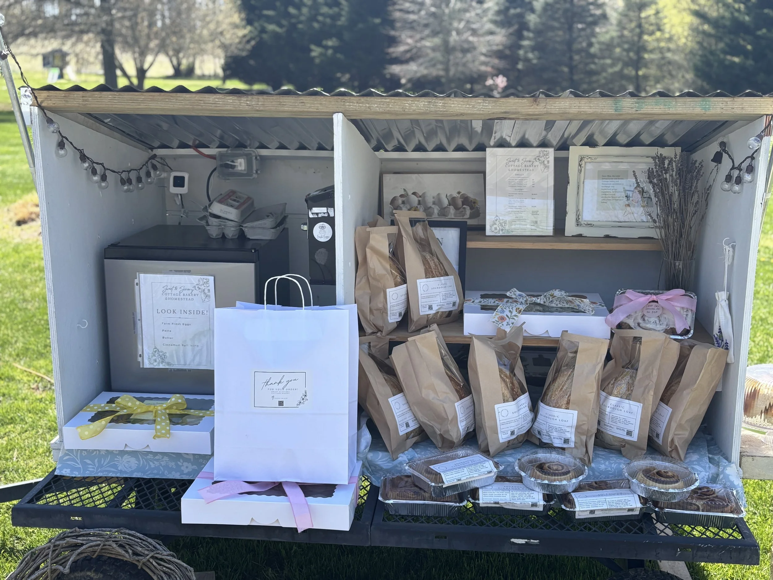 Early morning view of Sweet & Savory Cottage Bakery stand filled with fresh sourdough loaves, bagels, and sweet treats in Glen Rock, PA